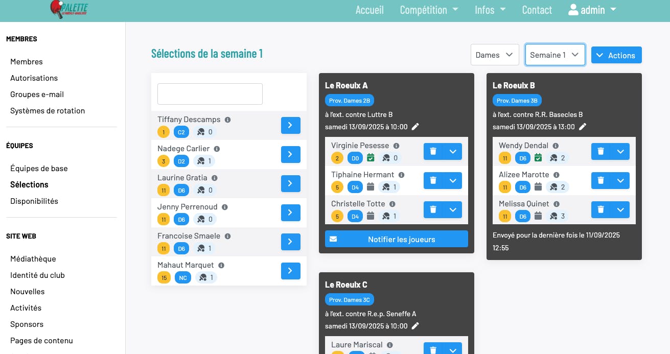 Lors de la préparation des sélections, vous verrez désormais l’index correct affiché selon le type de compétition. Par exemple, dans le championnat des vétérans, les indices de la liste de force des vétérans seront utilisés, et dans la compétition dames, les indices et classements de la liste de force dames seront visibles.