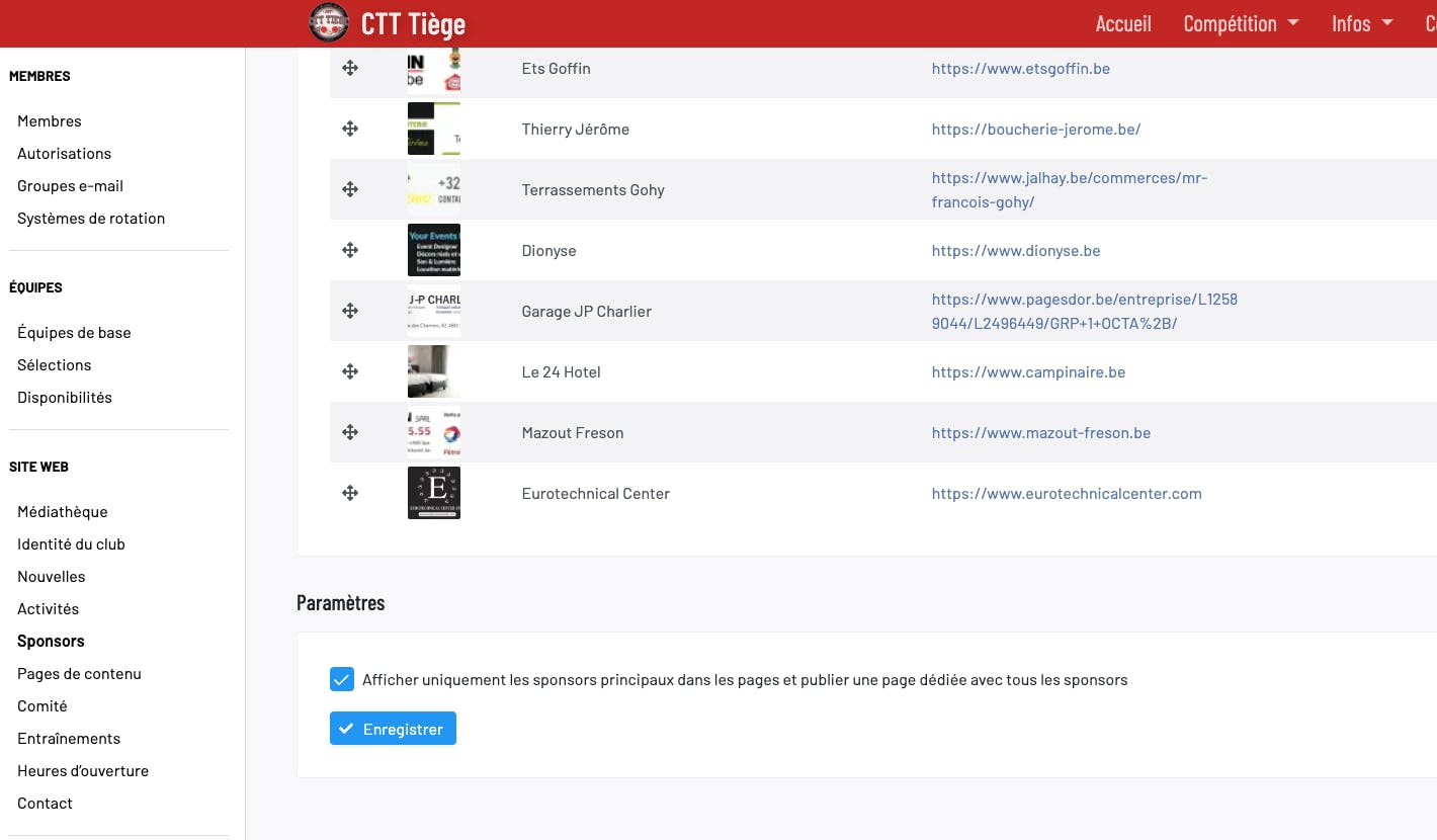 Certaines clubs ont la chance d’avoir beaucoup de sponsors. Jusqu’à présent, ils étaient tous affichés sur la page d’accueil et sur d’autres pages, ce qui pouvait rendre la navigation confuse. Il est désormais possible d’afficher uniquement les sponsors principaux sur ces pages. Lorsque cette option est activée, il est possible d’accéder via ces encadrés sponsors à une page sponsors distincte reprenant tous les sponsors de façon claire.